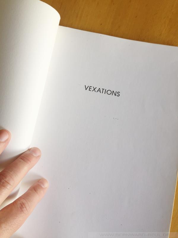 12. März 198527. Oktober 2023 Vexations VEXATIONS Fotokopie, 20 Seiten, 280 x 210 mm Um dieses Motiv 840 Mal hintereinander zu spielen, wird es gut sein, sich darauf vorzubereiten, und zwar in größter Stille, durch ernsthafte Bewegungslosigkeit.