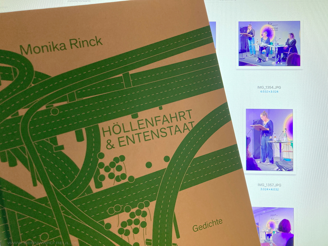 Monika Rincks neuer Gedichtband Höllenfahrt & Entenstaat (kookbooks 2024), ihr nunmehr sechster, erscheint fünf Jahre nach der Sammlung Alle Türen und zwölf Jahre nach den schon legendären Honigprotokollen. Wieder schöpft Rinck aus den entlegensten Quellen, Sachtexte werden für die Gedichte produktiv gemacht, in denen es um altägyptische Sargsprüche, um Geldwäsche im Kunsthandel oder um die epische katábasis und die Unterwelten der Moderne geht. Den Auftakt im Band bildet eine furiose Höllenfahrt auf deutschen Autobahnen. Immer entlang beschleunigter Straßenprojekte fädelt sich ein Jenseitsreisender mit seinem Verbrenner in den Berufsverkehr ein, durch den der Geist von Joseph Haydn rauscht. Er folgt einem Flüstern „von tief, tief unten, aus dem breiten Strom der Unterwelt“. Nebenbei verkompliziert eine Amöbe die Syntax, und eine Meta-Amöbe widerlegt die Verlusthypothese („Et jibt jezz keene Verluste!“). Einem müden Trucker erklingt ein betörendes Schlaflied, und eine schöne Stimme aus dem Radio verspricht die Errichtung einer güldenen Treppe, während die Utopie, die Ideen mit den Dingen zu vermählen, als trügerisch entlarvt wird. Als Zwischenspiel wird eine Entenstaat-Oper aufgeführt, außerdem gibt es Nachrichten aus der Kunstwelt in drei Teilen, Flugschauen und geknotete Leitern.
