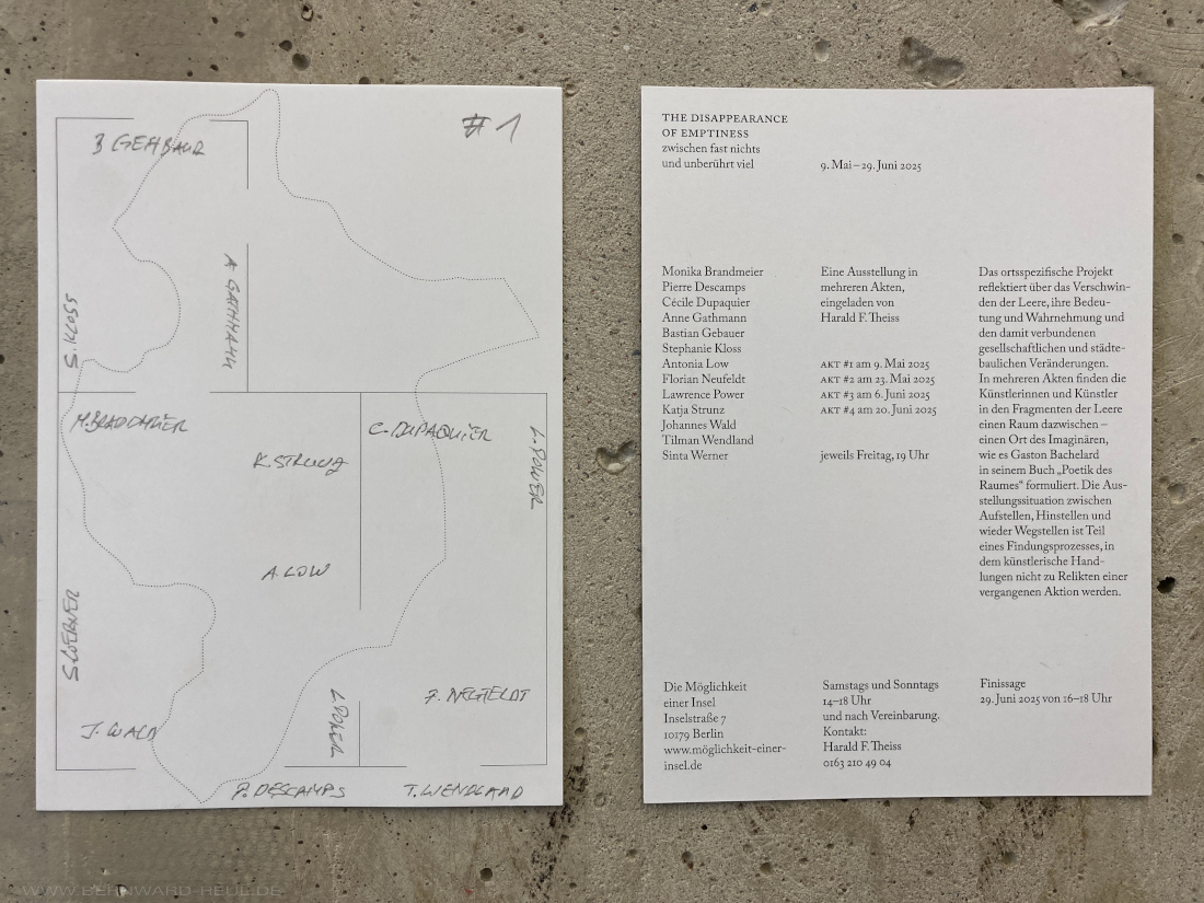 17. Mai 20256. August 2025 Disappearance of Emptiness #1 THE DISAPPEARANCE OF EMPTINESS zwischen fast nichts und unberührt viel Eine Ausstellung in mehreren Akten, eingeladen von Harald F. Theiss Die Möglichkeit einer Insel, Inselstraße 7, 10179 Berlin 9. Mai – 29. Juni 2025